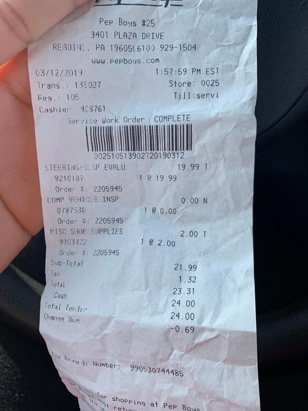 I brought my car to Pep Boys Lake Grove for state inspection in February and they required me to replace a rear toe control arm. My second time was 20 at a local Wheel Works which is Lyft approved. Every Pep Boys customer deserves to be treated with respect and quality customer service.